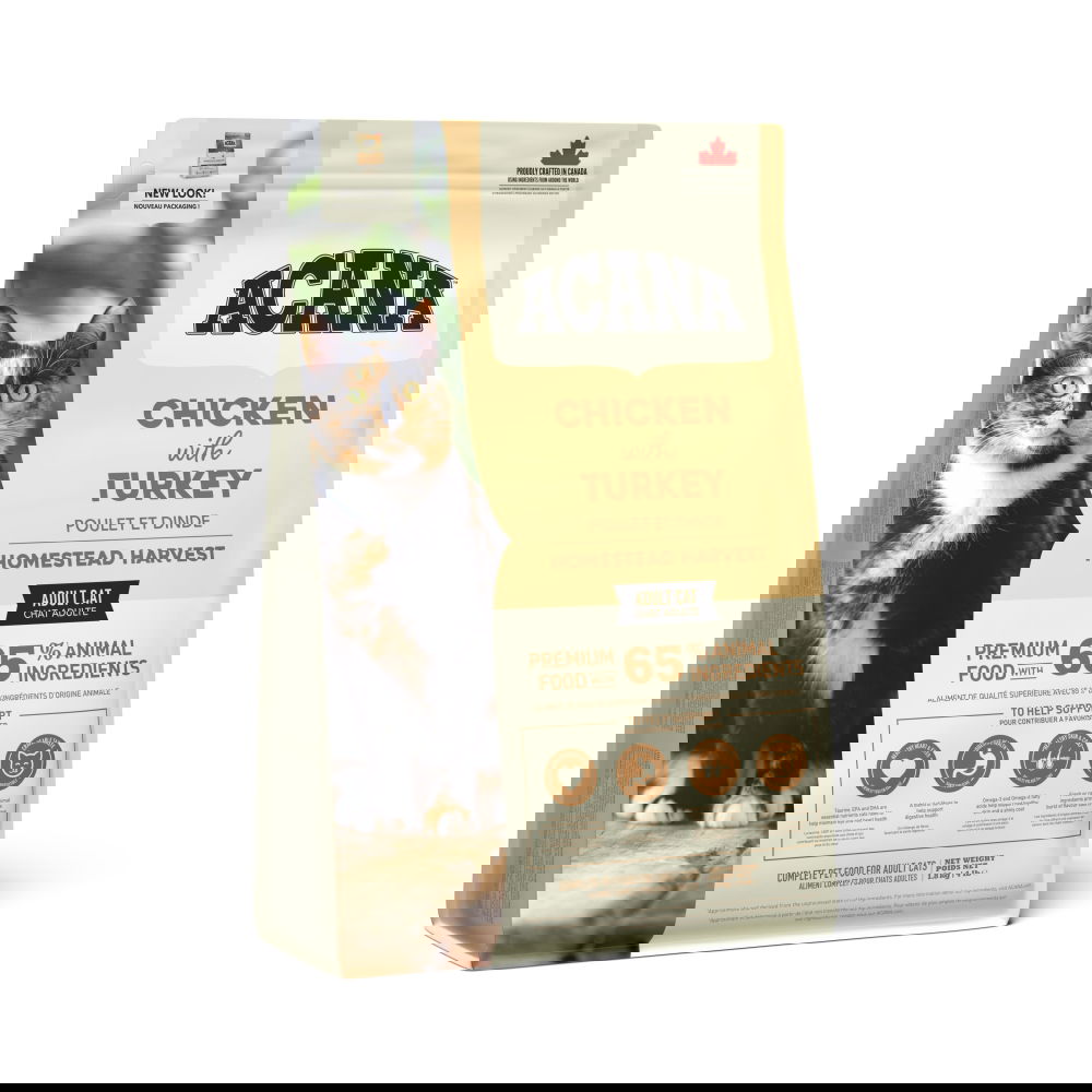 Acana Homestead Harvest on laadukas kissanruoka, joka sisältää 65 % eläinraaka-aineita vapaana kasvaneesta kanasta, kalkkunasta, kananmunasta ja ankasta wholepray-suhteella. Täysravinto sisältää luonnonmukaisessa ja tasapainoisessa suhteessa lihaa, sisäelimiä ja syötäviä rustoja, jotka sisältävät monipuolisesti ravintoaineita pitämään kissasi hyväkuntoisena. 65 % vapaana kasvanutta kanaa, kalkkunaa ja ankkaa sekä kananmunaa, joista 1/3 tuoretta siipikarjaa. Vastustuskykyä ja ruoansulatuselimistön hyvinvointia antioksidanteista, vitamiineista, kivennäis- ja hivenaineista. Sydämen ja silmien terveyttä tauriinista sekä EPA- ja DHA-rasvahapoista. Kiiltävä turkki ja terve iho tasapainoisesta suhteesta omega-rasvahappoja. Eläinraaka-aineet ja kylmäkuivattu maksa antavat kuivaruoalle vastustamattoman maun.