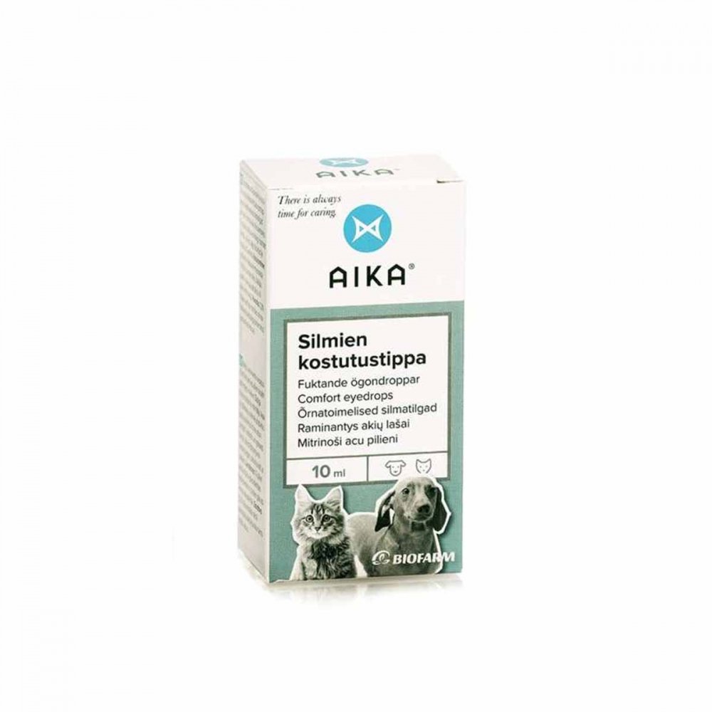 Aika silmien kostutustippa koirille ja kissoille kuivien silmien kostuttamiseen, kuivasilmäisyyteen tai tukihoidoksi vähentyneeseen kyynelnesteen tuottoon. Kissan ja koiran silmätipat sopivat erilaisiin silmien ärytystiloihin, kuten jos silmissä on pölyä, likaa tai hiekkaa. Vähentää silmien ärsytystä esim. siitepölyaikana. Voidaan käyttää myös kaneilla. Aika-silmien kostutustippa on säilöntäaineeton ja hellävarainen ilman eläinperäisiä ainesosia. Kostuttavana aineena luonnollinen hyaluronaani (vahvuus 0,2 %). Pakkauskoko 10 ml. Käyttö: tiputa kissalle tai koiralle silmätippoja 1-2 tippaa suoraan silmään. Käytä kolmen kuukauden kuluessa avaamisesta ennen viimeistä käyttöpäivää.