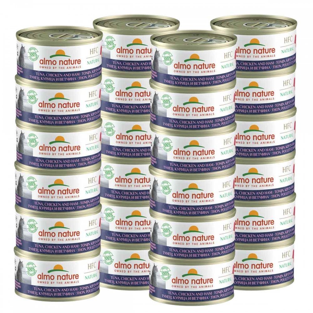 Almo Nature HFC tonnikala, kana ja kinkku 24 x 70 g on tukkupakkaus lihaisaa kissan märkäruokaa usealle aterialle! Täydennysravinto sopii kaikenikäisille kissoille esim. kuivaruoan oheen. Luonnollinen ja kevyt Almo Nature -kissanruoka on lisäaineeton, säilöntäaineeton ja väriaineeton. Hellävarainen valmistustapa omassa liemessään takaa ravintoarvojen säilymisen ja herkullisen maun. Gluteeniton koostumus sopii myös ruoka-aineyliherkille kissoille. Almo Nature -kissan märkäruoat tarjoavat eri makuvaihtoehtoja osana terveellistä kissan ruokintaa. Märkäruoasta kissa saa samalla nestettä, sillä kissan janontunne on luontaisesti heikko. Riittävä nesteensaanti ehkäisee tehokkaasti virtsatieongelmia. Gluteeniton, lisäaineeton ja väriaineeton Erittäin maistuja ja hyvin sulava Tuoreet, ihmisravinnoksi kelpaavat raaka-aineet Hellävarainen valmistustapa säilyttää ravinteet: kypsennetty ja säilötty omassa liemessään Täydennysravinto: tarjoa esim. kuivaruoan kanssa. Almo Nature lahjoittaa 100 % voitoistaan ilmaston, luonnon ja eläinten hyväksi.