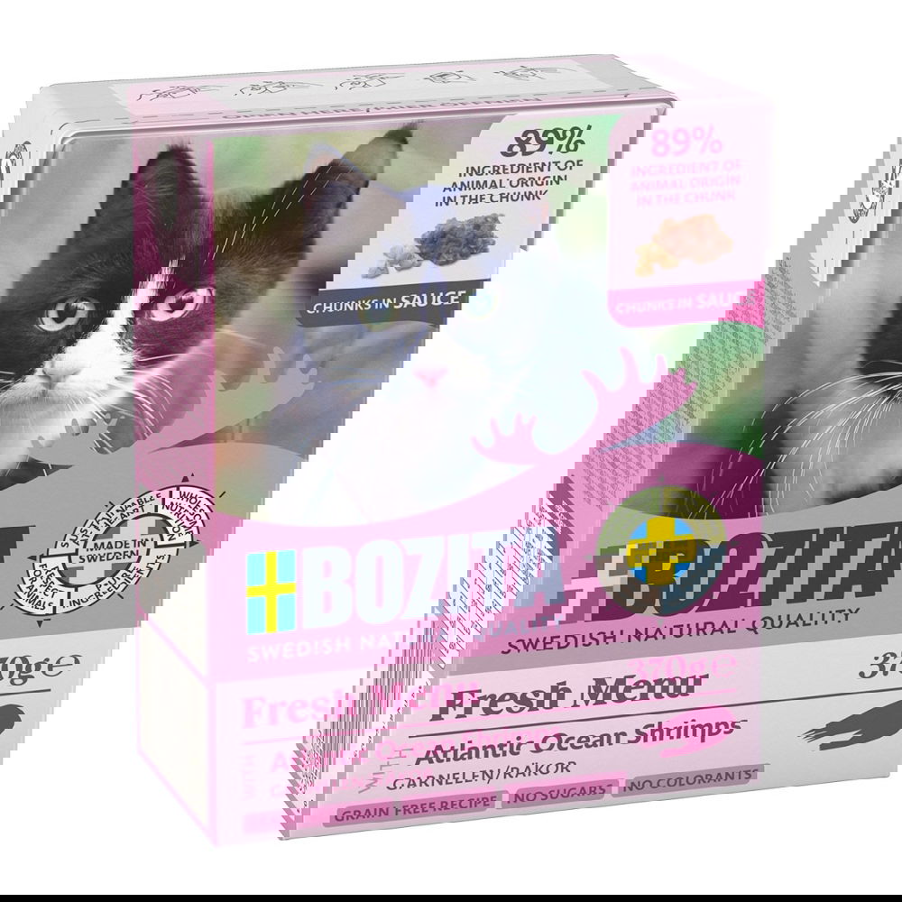 Kissan märkäruoka Bozita Feline katkarapu – herkullisia lihapaloja kastikkeessa Katkaravusta, kanasta, possusta ja naudasta valmistettu kissanmärkäruoka sisältää jopa 93 % lihaa. Ruoan maukas koostumus sisältää lihan paloja herkullisessa kastikkeessa. Ruoka sisältää kaikki kissan tarvitsemat ravintoaineet. · aikuisien kissan täysravinto · pakattu ympäristöystävälliseen tetrapakkaukseen · valmistettu Ruotsissa Ruoan koostumus on hyvin sulavaa ja erittäin maukasta. Se sisältää kaikki kissalle elintärkeät vitamiinit sekä kivennäisaineet, sekä luontaista beetaglukaania, joka vahvistaa kissan vastustuskykyä. Ruokintasuositus: Kissan paino (kg) Päiväannos (g) 1 75 2 150 3 230 4 300 5 380 6 455 7 530