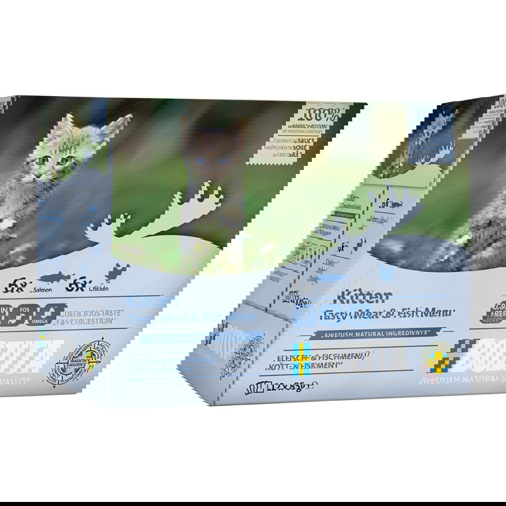 Bozita kitten lajitelma kastikkeessa 12 x 85 g on kissanpennun märkäruoka kanasta ja lohesta. Bozita-kissanruoka on ruotsalaista ja koostumuksessa on yhteensä 50 % lihaa ja kalaa. Kissanpennun märkäruoka sisältää herkullisia paloja maukkaassa kastikkeessa. Bozita-märkäruoka kissanpennulle maistuu ja sulaa hyvin. Terveen ruoansulatuksen edistämiseksi märkäruoka sisältää frukto-oligosakkarideja. viljaton kissanpennun märkäruoka ja täysravinto 6 x 85 g kana ja 6 x 85 g lohi sisältää kalaa ja lihaa yhteensä 50 % hyvin sulava ja hellävarainen koostumus pakattu ympäristöystävälliseen tetrapakkaukseen valmistettu Ruotsissa tarkoin valituista ruotsalaisista raaka-aineista.
