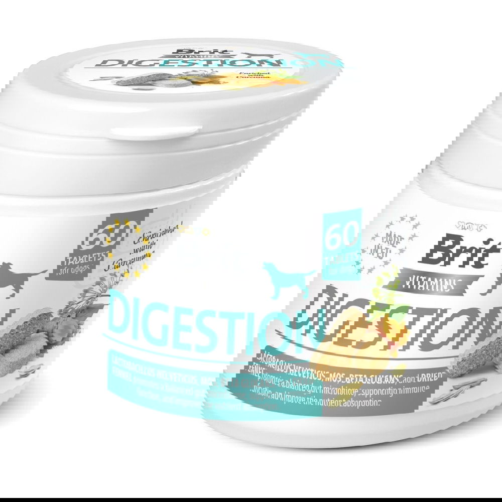 Brit Vitamins Digestion 120 g Brit Vitamins Digestion on probiootti koiralle ruoansulatuksen hyvinvoinnin tueksi. Sopii koiran ripuliin ruokavalion vaihdon tueksi antibioottikuurin jälkeen herkkävatsaisille koirille. Brit Vitamins Digestion sisältää mm. inuliinia, betaglukaania ja inaktivoituja maitohappobakteereja (Lactobacillus helveticus) ja kurkumaa. Mojave Yucca ja fenkoli auttavat edistämään ruoansulatuskanavan tasapainoa ja vähentävät epämukavuutta.  • Tukee ruoansulatuskanavan terveyttä • Helppo annostella päivittäin • Annostus: 1 tabletti per 15 kg painoa päivässä. • Pakkauksessa on 60 tablettia.