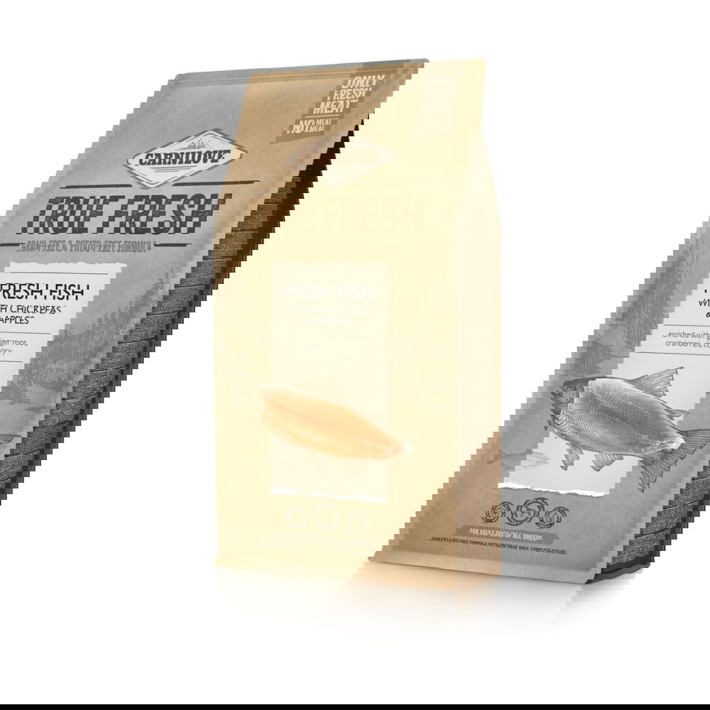 Carnilove True Fresh Kala -koiranruoka sisältää 60 % tuoretta kalaa ja 40 % vihanneksia, hedelmiä, yrttejä ja superruokaa. Korkealaatuinen, viljaton, perunaton ja GMO-vapaa koiranruoka kaikkien rotujen aikuisille koirille. Carnilove True Fresh -koiranruoat perustuvat ainoastaan tuorelihaan, mikä on koiralle luonnollista ravintoa. Korkea tuorelihapitoisuus tekee ruoasta erittäin maistuvaa ja proteiini sulaa 95 %:sesti, mikä tekee koko ruoasta paremmin sulavaa. Carnilove True Fresh -koiranruoka sisältää runsaasti aktiivisia aminohappoja ja ravintoaineita, jotka takaavat kudosten ravinteiden saannin. 60 % tuoretta kalaa 40 % vihanneksia, hedelmiä, yrttejä ja superruokaa Perunaton, GMO-vapaa ja viljaton koiranruoka. Erittäin maistuva: 1 kg kuivaruokaa sisältää 600 g tuoretta kalaa. Tuore kala sulaa 95 %:sesti ja sisältää aktiivisia aminohappoja sekä ravintoaineita. Raaka-aineet paikallisilta tšekkiläisiltä, luotettavilta toimittajilta. Edistää tervettä ruoansulatusta ja aineenvaihduntaa. Lisänä inkivääriä, karpaloa ja sikuria. Kuitupitoinen koostumus tukee ruoansulatusta ja normaalipainossa pysymistä. Luonnon antioksidantit ja prebiootit vahvistavat immuunijärjestelmää.