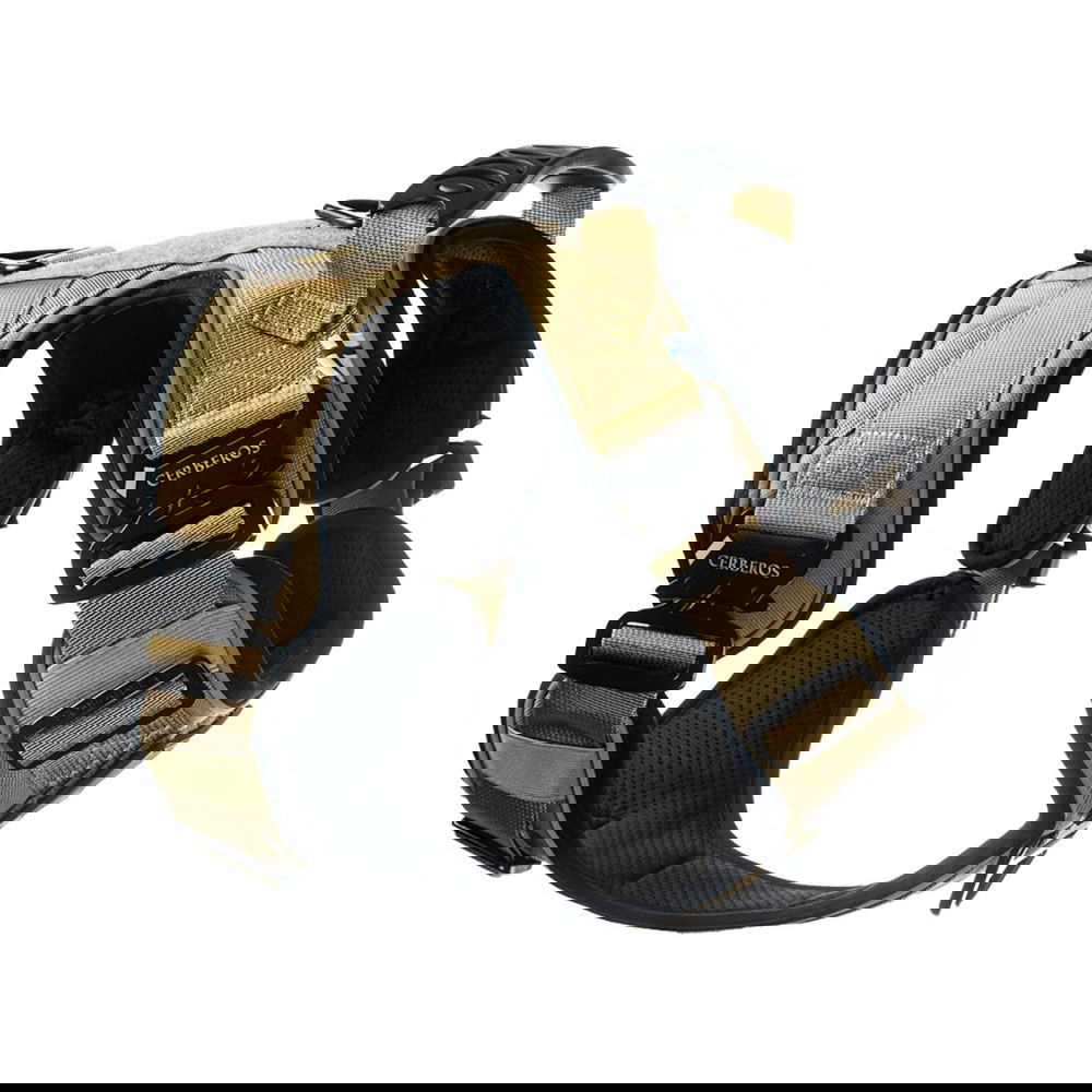 Cerberos Active -valjas korkealaatuinen ja erittäin kestävä voimakkaille koirille. Cerberos-valjaat ovat suomalaista suunnittelua, joka vie koiran valjaat uudelle tasolle. Suunnittelussa on huomioitu ergonomia ja kaikki materiaalit ja ratkaisut ovat tinkimättömiä. Cerberos-valjaat ovat käytössä Suomen Puolustusvoimien koiraosastoilla. Cerberos Active -valjaat koostuvat selkä- ja rintaosasta ja valjaita voi säätää usean senttimetrin. Molemmilla puolilla on kiinnityssoljet, minkä ansiosta valjaat aukeavat kokonaan ja ne on helppo pukea ja riisua. Y-valjaat antavat tilaa lavoille koiran liikkuessa ja jakavat paineen nykäyksissä koiran rintakehälle. Cerberos Active -valjaat kestävät todella kovaa vetoa ja kulutusta. Soljet ovat täysmetallia, joka kestää sekä kovaa kulutusta että muuttuvia sääolosuhteita, kuten pakkasta murtumatta. Valjaissa on kolme täysmetallista kiinnityslenkkiä taluttimelle: kaksi kolmiolenkkiä selässä ja yksi edessä. Rinnan kiinnityslenkkiin voit kiinnittää monitoimihihnan toisen pään, jolloin valjaat toimivat kuin reaktiovaljaat ja kääntävät koiran etuosaa kohti taluttajaa, jos koira vetää hihnassa.  Valjaat ovat laadukasta 1050D-nailonia ja ommeltu vahvistetuilla tikkauksilla. Sisäpinnalla on hengittävä mesh-vuoraus ja valjaat on pehmustettu painekohdista. Selässä on tukeva hallintakahva ja integroitu heijastinreunus lisää näkyvyyttä pimeällä. Cerberos-valjaiden selkäosassa on velcrotarrapinta, joihin voi kiinnittää Cerberos-kylkiheijastimet, -huomiovalon, -kakkapussikotelon tai -ensiapulaukun. Kestävät ja laadukkaat Cerberos-valjaat kestävät kovaa vetoa ja kulutusta. Suomalaista suunnittelua. Ergonomiset Y-valjaat aukeavat kokonaan ja ne on helppo pukea ja riisua. Täysmetalliset soljet ja lukot, jotka kestävät kovaa vetoa ja erilaisia sääolosuhteita. Kaksi kiinnityssolkea molemmin puolin valjaita. Kaksi kiinnityslenkkiä selässä ja yksi rinnassa. Huomaa: metalliosat tuovat valjaisiin painoa. Selässä hallintakahva. Pintamateriaali 1050D-nailonia. Sisäpuolella hengittävä mesh-polyesterikangas. Selkäosassa on velcrotarrapinta, johon voi kiinnittää Cerberos-kylkiheijastimet, -huomiovalon, -kakkapussikotelon tai -ensiapulaukun. Heijastinreunus antaa näkyvyyttä. Käsinpesu ja ilmakuivaus auringolta suojattuna. Auringonvalo voi haalistaa väriä. Väri hiekka. Cerberos Tactical ja Active -valjaiden erot: Active-valjaiden selkäosasta on vähennetty materiaalia selästä, niskasta ja kainaloista. Active-valjaiden L-koko on 8 cm lyhyempi ja XL-koko 9 cm lyhyempi kuin Tactical-valjaat. Active-valjaissa ei ole selässä molle-kujastoa eikä narusarjaa. Selkäosassa on velcrotarrapinta esim. heijastimelle tai muille varusteille. Rintaosa sekä kaulan ja rintaosan remmien mitat ovat identtiset. Cerberos-tuotteilla on takuu Valmistaja tarjoaa Cerberos-tuotteille rajoitetun elinikäisen takuun, joka kattaa valmistus- ja materiaalivirheet normaalissa ulkoilukäytössä. Mitä Cerboroksen takuu kattaa? Materiaali- ja valmistusvirheet (esim. hihnojen, solkien tai ompeleiden pettäminen ilman ulkoista syytä). Mitä takuu ei kata? Ulkoisen esineen kuten kiven, oksan tai muun terävän esineen aiheuttamaa vaurioitumista. Puremisen, raapimisen tai muun eläimen aiheuttaman vahingon. Väärinkäyttöä tai virheellistä huoltoa.