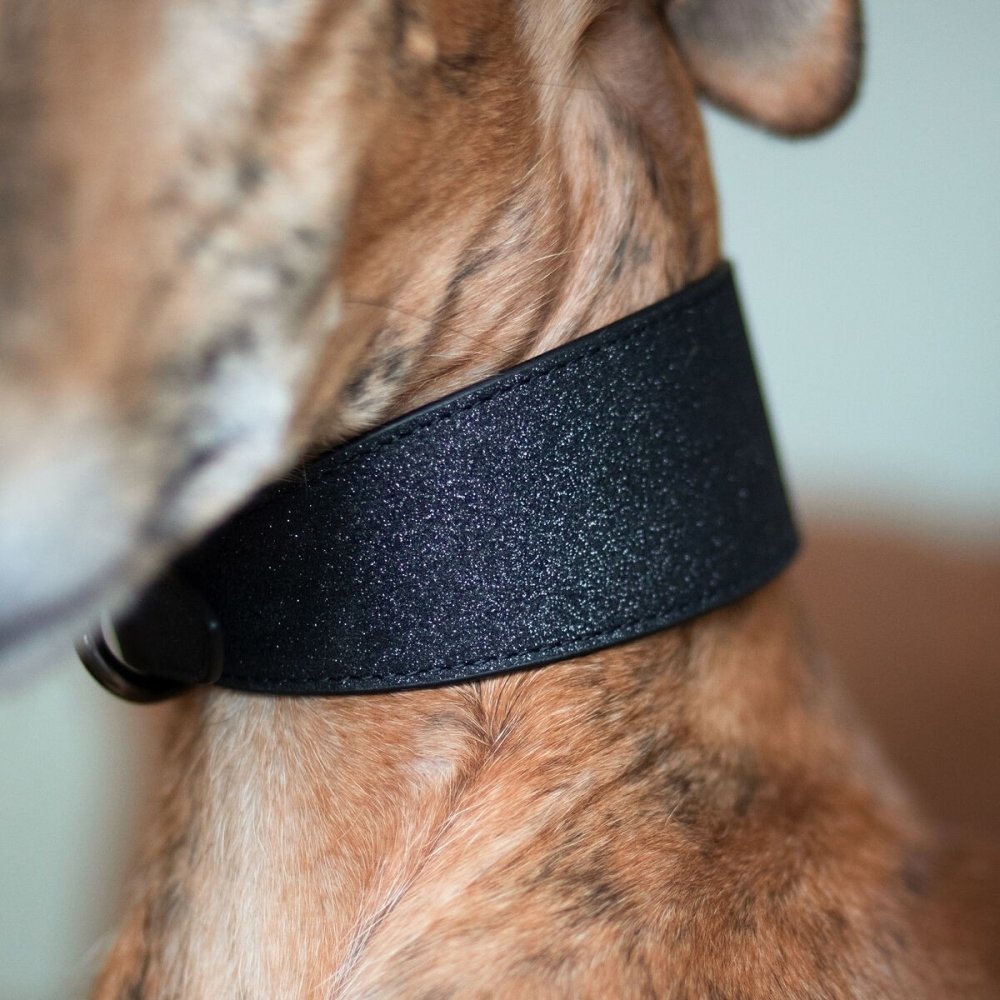 Collar of Sweden leveä solkipanta on ergonominen ja tyylikäs himmeällä glitterinhohdolla. Leveä solkipanta on vegaanista nahkaa, joka on säänkestävää ja miellyttävän tuntuista, kuin aitoa nahkaa. Leveä vinttikoirapanta jakaa nykäyksissä paineen ja ennaltaehkäisee vammoja: panta on kapeampi solkipuolelta ja leveämpi toiselta puolelta. Hoito-ohje: Käytä pantaa vain ulkoillessa. Pidä panta yhteen kiinnitettynä ja pyöreänä, kun se ei ole käytössä. Kuivaa kastunut kaulapanta. Pyyhi likaantunut panta kostealla rätillä. Voit myös käyttää PU-nahan puhdistus- ja -hoitoainetta synteettiselle nahalle. Vaihtele kaulapantoja eri päivinä, niin ne pysyvät parempana pitkään. Glitterpinta voi kulua käytössä.