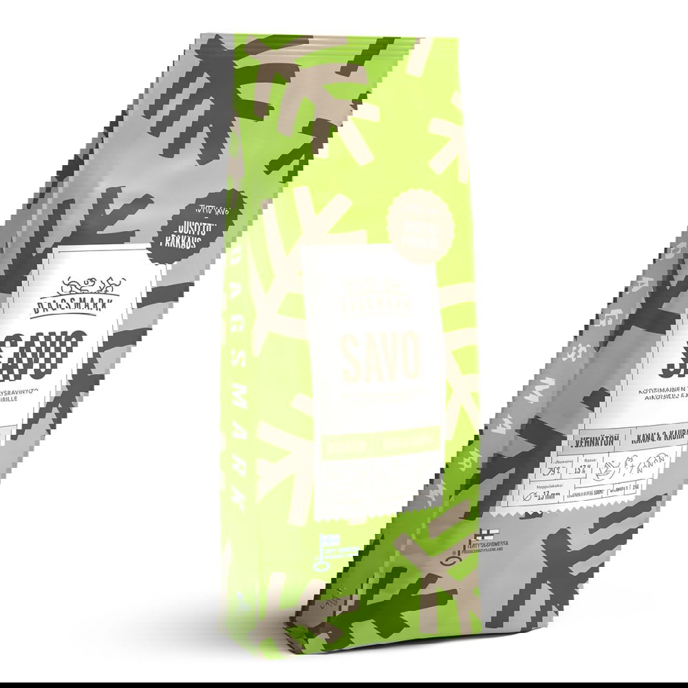 Dagsmark SAVO – vehnätön suomalainen koiranruoka Dagsmark SAVO on kotimainen, vehnätön täysravinto aikuisille koirille. Tämä suomalainen koiranruoka valmistetaan Loimaalla kotimaisista raaka-aineista – ekologinen ja vastuullinen valinta koirasi hyvinvointiin ja ympäristön hyväksi. Miksi valita Dagsmark SAVO? Vehnätön täysravinto – sopii monelle herkkävatsaiselle koiralle Kotimainen kaura – vatsaystävällinen ja luonnostaan gluteeniton Camelinaöljy – omega-3 ja -6 rasvahappoja turkin ja ihon tueksi Luonnolliset raaka-aineet – kana, kaura ja peruna Ekologinen ja vastuullinen – valmistettu Suomessa, dagsmarkilla on Avainlippu Ei turhia lisäaineita – ei vehnää, soijaa, maissia, säilöntä-, aromi- tai väriaineita Ekologinen ja kotimainen Dagsmark SAVO on ekologinen koiranruoka, joka valmistetaan Suomessa lähellä tuotetuista raaka-aineista. Valitsemalla SAVOn tuet kotimaista työtä ja pienennät hiilijalanjälkeäsi. UKK – Usein kysytyt kysymykset 1. Onko Dagsmark SAVO täysin vehnätön? Kyllä, resepti ei sisällä vehnää, soijaa eikä maissia. 2. Miten SAVO eroaa LAPPI -ruoasta? SAVO sisältää kotimaista kauraa ja perunaa, kun taas LAPPI on täysin viljaton perunapohjainen ruoka. 3. Sopisiko SAVO herkkävatsaiselle koiralle? Kyllä, kotimainen kaura on hellävarainen kuidun lähde ja tukee vatsan toimintaa.