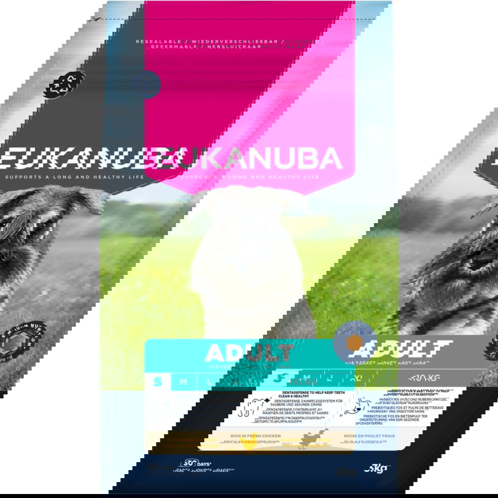 Eukanuba Adult Small 15 kg on tasapainoinen koiranruoka alle 10 kg painoisille, yli vuoden ikäisille aikuisille koirille kahdeksan vuoden ikään saakka. Räätälöity ravitsemus pitkään ja terveelliseen elämään. Tukee lihaskuntoa, tasapainoisesti energiaa. Sisältää natriumhexametafosfaattia, joka tunnetaan myös nimellä EUKANUBA Denta Defence. Kliinisesti todistettu vähentävän plakkia jopa 80 % 28 päivän aikana. E- ja C-vitamiinit tukevat vastustuskykyä. Omega-3- ja -6-rasvahapot edistävät ihon ja turkin hyvinvointia. Optimaalisesti kalsiumia pitämään luut vahvoina. Ei sisällä keinotekoisia maku- tai väriaineita eikä geenimuunneltuja ainesosia. Ympäristöystävällinen tuotanto: vähintään 25 % tehtaan käyttämästä energiasta tuotetaan Eukanuban tuulivoimalassa. Täysravinto sisältää runsaasti tuoretta kanaa, mikä takaa maistuvuuden. Uudistuneessa, kuusikulmaisessa nappulassa on pyöristetyt kulmat ja vähemmän pinta-alaa: rasva on tasaisesti nappulan pinnalla, mikä tekee niistä herkullisia. Adult Small -nappuloiden koko on 10 x 6 mm. Erityinen nappulamuoto yhdessä Denta Defence -hammashoidon kanssa auttavat pitämään hampaat ja ikenet terveinä. Uudelleensuljjettava säkki pitää maut tallessa ja ruoan maistuvana. Vuodesta 1969 Eukanuba on huolehtinut koirien ravitsemuksellisesta hyvinvoinnista ja ymmärtänyt, mitä vaaditaan ylläpitämään koirien ihanteellista fyysistä kuntoa. Eukanuba – ravitsemusasiantuntijoiden kehittämä, eläinlääkärien hyväksymä ja kasvattajien suosittelema. Eukanuba-koiranruoat valmistetaan Alankomaissa ja ne käyvät läpi 120 laatutestiä.