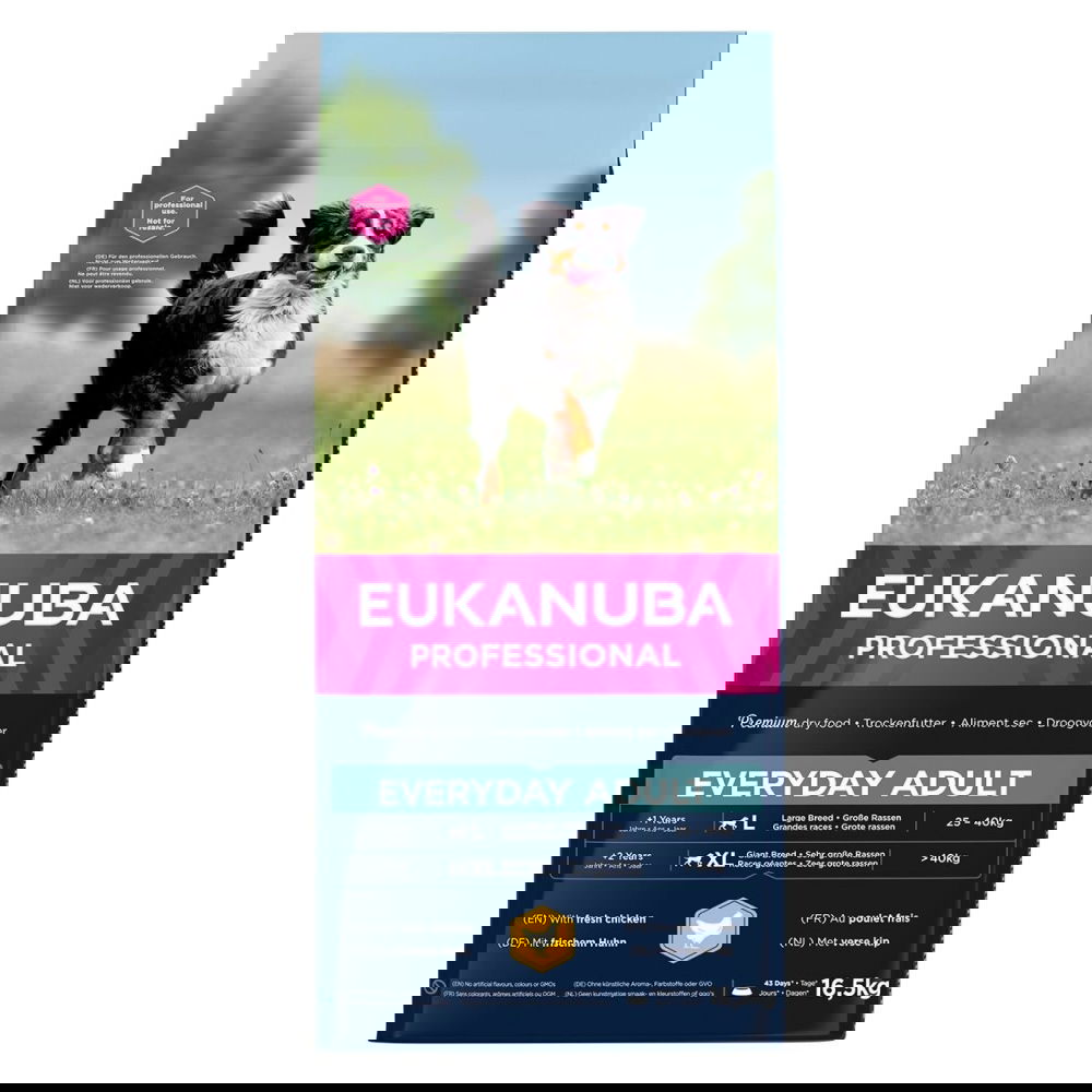 Eukanuba Everyday Adult Large on koiranruoka suurille roduille. – Omega-3- ja -6-rasvahapot kiiltävälle ja terveelle iholle sekä turkille. – Tasapainoinen mineraali- ja vitamiinipitoisuus tukee nivelten ja luiden terveyttä. – Abtioksidanttiset E- ja C-vitamiinit tukevat vastustuskykyä. – Juurikaskuitu yhdessä prebioottien kanssa tukevat ruoansulatuselimistön terveyttä. – Korkealaatuinen eläinproteiini yhdessä mineraalien kanssa ylläpitävät vahvoja lihaksia. – Rouskuvat nappulat auttavat pitämään hampaat terveinä.