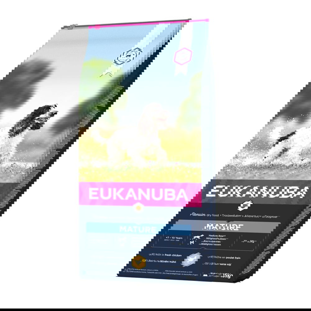 Eukanuba Mature Medium on tasapainoinen koiranruoka 10-25 kg painoisille, +7-10-vuotiaille koirille. Räätälöity ravitsemus pitkään ja terveelliseen elämään. – Tukee tervettä ikääntymistä – L-karnitiini tukee ihannepainon ylläpidossa ja ehkäisee ylipainoan kertymistä. – Sisältää natriumhexametafosfaattia, joka tunnetaan myös nimellä EUKANUBA Denta Defence. Kliinisesti todistettu vähentävän plakkia jopa 80 % 28 päivän aikana. – Glukosamiini ja kondroitiini auttavat ylläpitämään nivelten terveyttä ja aktiivista liikkumista. – Omega-3- ja -6-rasvahapot edistävät ihon ja turkin hyvinvointia. – Juurikasmassa edistää tervettä ruoansuolatusta. – Optimaalisesti kalsiumia pitää luut vahvoina. – Ei sisällä keinotekoisia maku- tai väriaineita eikä geenimuunneltuja ainesosia. – Ympäristöystävällinen tuotanto: vähintään 25 % tehtaan käyttämästä energiasta tuotetaan Eukanuban tuulivoimalassa. Täysravinto sisältää runsaasti tuoretta kanaa, mikä takaa maistuvuuden. Uudistuneessa, kuusikulmaisessa nappulassa on pyöristetyt kulmat ja vähemmän pinta-alaa: rasva on tasaisesti nappulan pinnalla, mikä tekee niistä herkullisia. Mature Medium -koiran kuivaruoan nappuloiden koko on 14 x 7 mm. Erityinen nappulamuoto yhdessä Denta Defence -hammashoidon kanssa auttavat pitämään hampaat ja ikenet terveinä. Uudelleensuljettava säkki pitää maut tallessa ja ruoan maistuvana. Vuodesta 1969 Eukanuba on huolehtinut koirien ravitsemuksellisesta hyvinvoinnista ja ymmärtänyt, mitä vaaditaan ylläpitämään koirien ihanteellista fyysistä kuntoa. Eukanuba – ravitsemusasiantuntijoiden kehittämä, eläinlääkärien hyväksymä ja kasvattajien suosittelema. Eukanuba-koiranruoat valmistetaan Alankomaissa ja ne käyvät läpi 120 laatutestiä.