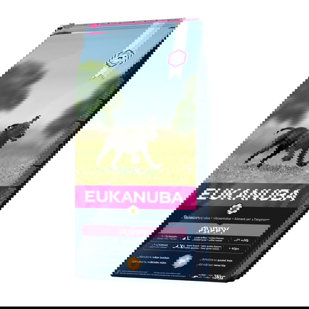 Eukanuba Life Care Puppy Large Breed – Turvallista kasvua suurikokoiselle pennulle Eukanuba Puppy Large -penturuoka on tasapainoinen koiranpennun kuivaruoka suurikokoisiksi kasvaville pennuille, joiden aikuispaino on yli 25 kg. Eukanuba Puppy Large -penturuoka on räätälöity keskikokoisten koiranpentujen ravitsemuksellisiin tarpeisiin vuoden ikään saakka. 100 % tasapainoinen resepti antaa pennulle kaikki sen tarvitsemat ravintoaineet terveeseen kasvuun. Eukanuba Puppy Large Breed -penturuoka suurille roduille on suunniteltu tukemaan tasapainoista, hallittua kasvua pennun tärkeänä kasvuaikana. Suurten rotujen pennuilla on erityistarpeita – erityisesti luiden, nivelten ja lihasten osalta. Tämä resepti sisältää ihanteellisen määrän kalsiumia, hyvin sulavaa proteiinia ja vatsaystävällisiä kuituja, jotka tukevat koiran tervettä kehitystä ja vähentävät ylikuormituksen riskiä nivelille. Räätälöity ravitsemus pitkään ja terveelliseen elämään. Hyödyt ja ominaisuudet: DHA-rasvahapot tukevat oppimista ja aivojen kehitystä Tarkkaan säädetty kalsiumtaso tukee luuston kehitystä suurilla roduilla Prebiootit FOS & MOS sekä juurikasmassa edistävät vatsan ja suoliston hyvinvointia Luonnolliset omega-6 ja -3 auttavat pitämään ihon terveenä ja turkin kiiltävänä Antioksidanttisuoja E-vitamiinin kanssa tukee kasvavan pennun immuunijärjestelmää Tuore kana tarjoaa helposti sulavaa eläinproteiinia lihaksiston kehityksee Ei sisällä keinotekoisia maku- tai väriaineita eikä geenimuunneltuja ainesosia. Ympäristöystävällinen tuotanto: vähintään 25 % tehtaan käyttämästä energiasta tuotetaan Eukanuban tuulivoimalassa. Eukanuba Puppy Large -penturuoka sisältää runsaasti tuoretta kanaa, mikä takaa maistuvuuden. Kuusikulmaisessa nappulassa on pyöristetyt kulmat ja vähemmän pinta-alaa: rasva on tasaisesti nappulan pinnalla, mikä tekee niistä herkullisia. Puppy Large -nappuloiden koko on 11 x 7 mm. Erityinen nappulamuoto yhdessä Denta Defence -hammashoidon kanssa auttavat pitämään hampaat ja ikenet terveinä ja puhtaina. Uudelleentuoljettava säkki pitää maut tallessa ja ruoan maistuvana. Vuodesta 1969 Eukanuba on huolehtinut koirien ravitsemuksellisesta hyvinvoinnista ja ymmärtänyt, mitä vaaditaan ylläpitämään koirien ihanteellista fyysistä kuntoa. Eukanuba – ravitsemusasiantuntijoiden kehittämä, eläinlääkärien hyväksymä ja kasvattajien suosittelema. Eukanuba-koiranruoat valmistetaan Alankomaissa ja ne käyvät läpi 120 laatutestiä.