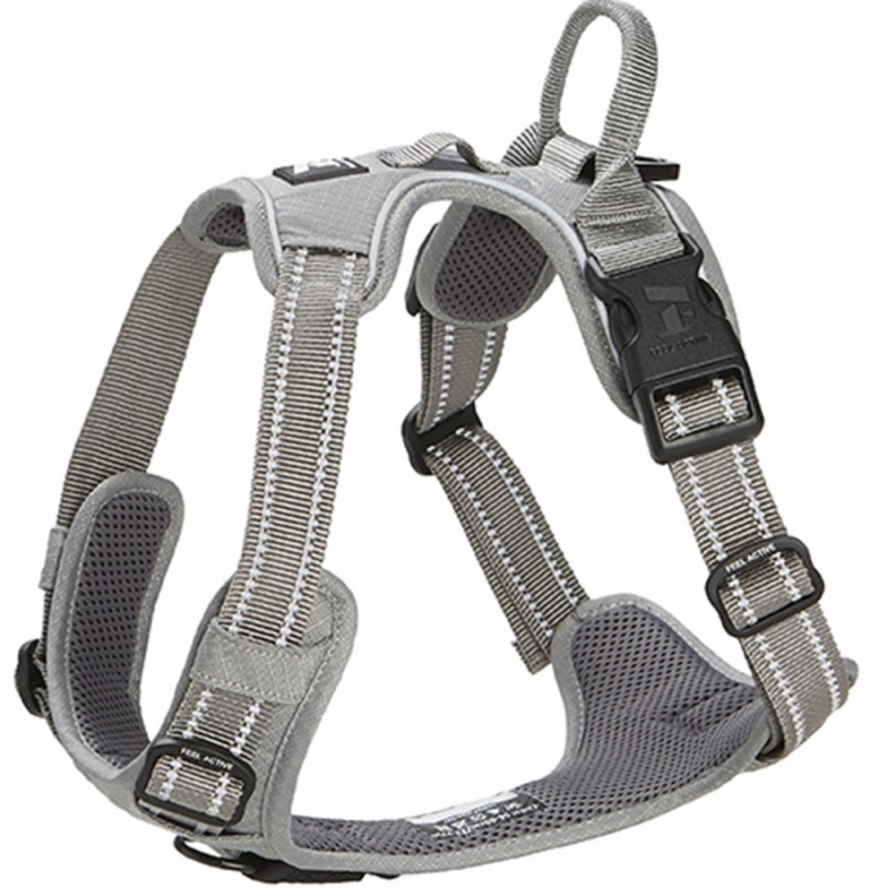Koiran valjaat Feel Active Training, harmaa on mainio valjas ulkoiluun vahvoille koirille sekä koiran kanssa vaeltamiseen. Training-koiran valjaissa on vahva rakenne ja kahva selässä, jonka avulla voit auttaa koiraa hankalassa maastossa tai vaativissa tilanteissa tuomaan lisäkontrollia. Jos koira vetää, voit kiinnittää hihnan edessä olevaan renkaaseen ja käyttää valjaita reaktiovaljaina. Kun edessä oleva lenkki ei ole käytössä, voit kääntää sen piiloon. Valjaiden etuosa on teflon-käsiteltyä kangasta, joka hylkii likaa ja tekee valjaista helposti puhtaana pidettävät. Teflon-käsittely ei vaikuta kankaan hengittävyyteen tai tuntumaan. Valjaissa on heijastavat tereet ja 3M-heijastinomeleet antamaan näkyvyyttä pimeällä liikuttaessa. Eronominen muotoilu tekee valjaista mukavat päällä ja ne eivät häiritse koiran liikkumista. Leveä etuosa jakaa paineen tasaisesti, jos koira vetää. Valjaista voi säätää sekä kaulan- että rinnanympäryksestä sopimaan koirallesi. Pikalukot molemmin puolin valjaita tekevät niistä helpot pukea ja riisua nostamatta etujalkaa. Valjaiden selkäosassa on pieni kangaslenkki nimilaattaa tai huomiovaloa varten. Kestävä materiaali on ommeltu huolellisesti. Hyvä työnlaatu yhdessä korkealaatuisten metalliosien ja -pikalukkojen kanssa takaavat valjaiden pitkän käyttöiän. Koira Valjaat Koko: rinnanympärys (cm) Niska (cm) Rinnanympärys (cm) XS: 33-43 25,5-38 36-43 S: 43-56 31,5-50 43-56 M: 56-69 32,5-52 56-74 L: 69-81 39,5-56,5 69-89 XL: 79-95 45-77,5 81-107