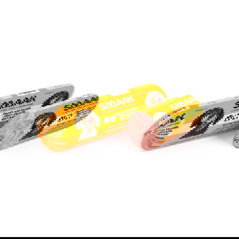 Koiranmakkara SMAAK ankka-kalkkuna on viljaton, gluteeniton ja sisältää 72 % eläinperäisiä raaka-aineita. Eläinproteiininlähteinä on ankkaa ja kalkkunaa, mitkä sopivat myös monille allergisille ja herkkävatsaisille koirille. Luonnollinen koostumus on sokeritonta, lisäaineetonta ja väriaineetonta. Koiranmakkara on herkullista täysravintoa myös nirsommille koirille ja se sopii tarjottavaksi sellaisenaan tai antamaan kuivaruokaan lisämakua. Avaamaton koiranmakkara säilyy huoneenlämmössä, avattuna jääkaapissa 3 päivää. Pakkauskoko 800 g.