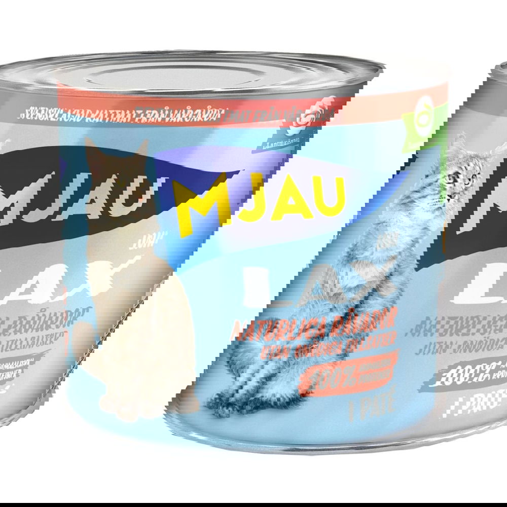 Mjau patee lohella on viljaton ja sokeriton kissan märkäruoka luonnollisista raaka-aineista ilman tarpeettomia lisäaineita. Herkullinen Mjau-märkäruoka valmistetaan Ruotsissa Vårgårdanissa ympäristöystävällisesti laadukkaista raaka-aineista 100 % uusiutuvalla energialla. Pateen valkuaisesta 100 % on eläinperäistä lihansyöjän tarpeisiin. Ruoassa käytetty lohi on WWF:kalaoppaan ohjeiden mukaisesti kestävästi pyydettyä. Täysravinto sisältää kissan tarvitsemat vitamiinit ja tauriinia. Metallipurkin koko 635 g. Sopii mm. usean kissan kotiin. Ainoana ruokana tarjoa 4 kg painoisella aikuiselle kissalle noin 260 g päivässä. Raaka-aineet tulevat ihmisravinnon sivuvirroista, mikä varmistaa korkean laadun ja on ympäristöystävällistä.