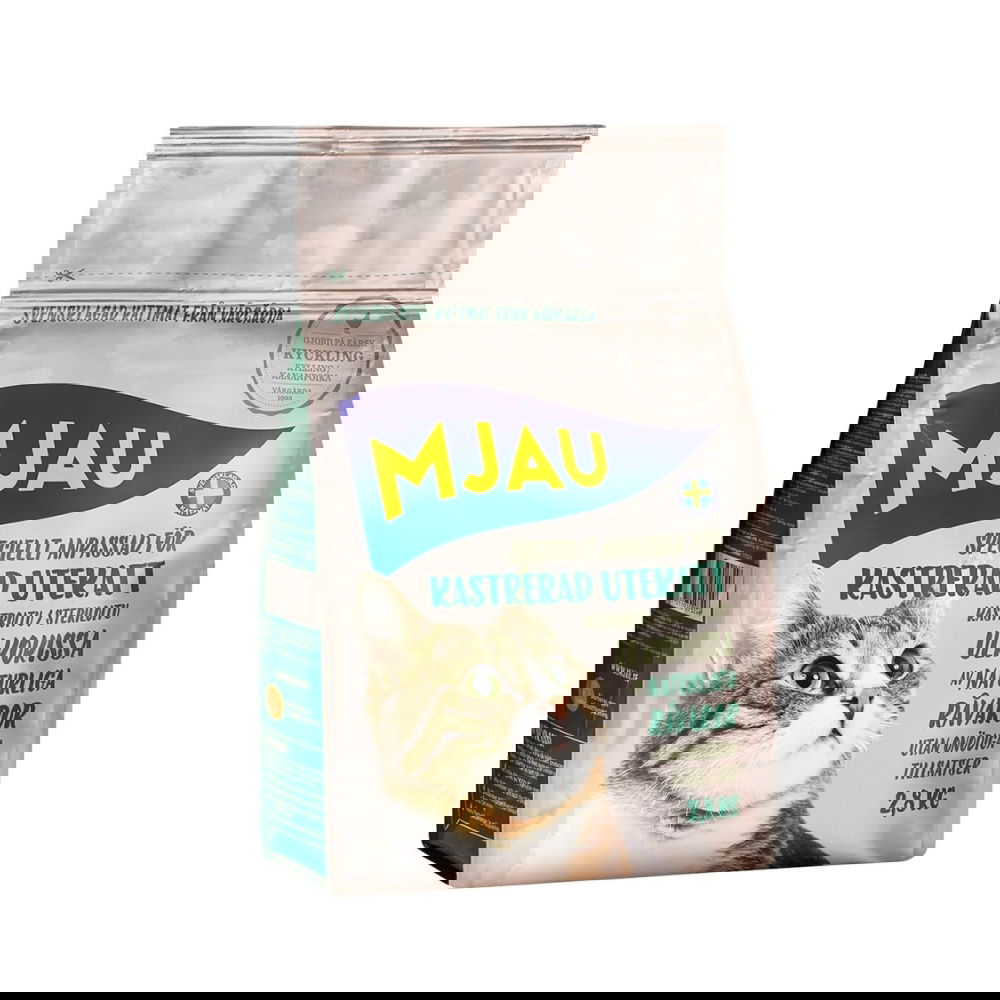 Mjau-steriloitu ulkokissa on aikuisen kissan kuivaruoka liikkuville, steriloiduille kissoille. Täysravinto sisältää mm. tuoretta kanaa. Sterilointi hidastaa kissan aineenvaihduntaa ja lisää ruokahalua, mikä voi altistaa ylipainon kertymiselle. Kissan ulkoiluttaminen kuitenkin lisää kissan energiankulutusta ja kuivaruoan kaloripitoisuus on sovitettu näihin tarpeisiin. Tasapainotetut kivennäiset ennaltaehkäisevät virtsakivien muodostumista. Mjau-kissanruoat valmistetaan Ruotsissa Vårgårdan maaseudulla 100 % uusiutuvalla energialla toimivalla tehtaalla.