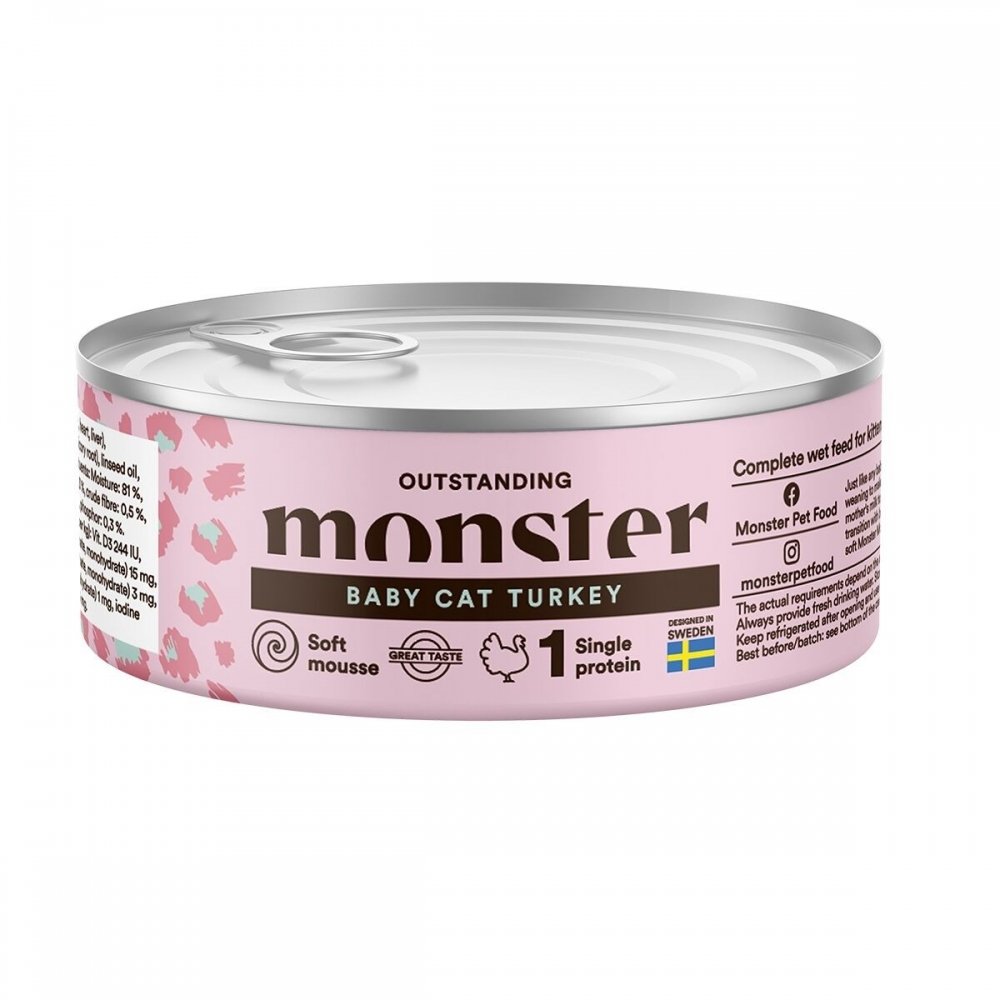 Monster Cat Baby Mousse Can on kissanpennun märkäruoka vieroituksesta täysikasvuiseksi. Sopii myös emoille tiineyden lopusta imetyksen ajaksi. Moussessa on sileä, pehmeä ja helposti syötävä koostumus ja erinomaisen maistuva maku. Kalkkuna ainoana proteiininlähteenä on hellävaraista ruoansulatukselle. Laadukas täysravinto sisältää kaikki kasvavan kissanpennun tarvitsemat ravintoaineet ja antaa emolle tarvittavaa energiaa. Purkin koko 100 g.