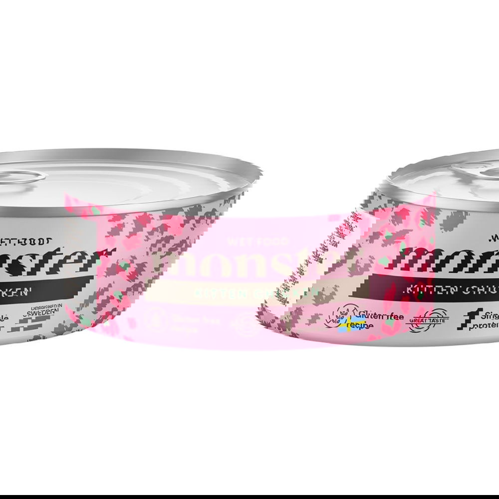 Monster Cat Kitten Chicken 100 g Monster Cat Kitten Chicken Can ei ole vain herkkua makunystyröille, vaan myös tasapainoinen täysravinto, joka tarjoaa kissanpennullesi kaikki tarvittavat ravintoaineet ja nesteytyksen kasvaakseen vahvaksi ja terveeksi. Korkea maittavuus: Houkuttelee myös nirsoja syöjiä. Gluteeniton resepti: Sopii herkälle ruoansulatukselle. Yksi eläinproteiininlähde: Sisältää vain kanan proteiinia, joka on helposti sulavaa. Kosteuspitoisuus: 80 % vettä tukemaan pentujen nesteytystä. Ruokintaohje: 2–3 kuukauden ikäisille: 210–245 g päivässä 4–5 kuukauden ikäisille: 260–270 g päivässä 6–12 kuukauden ikäisille: 265 g päivässä