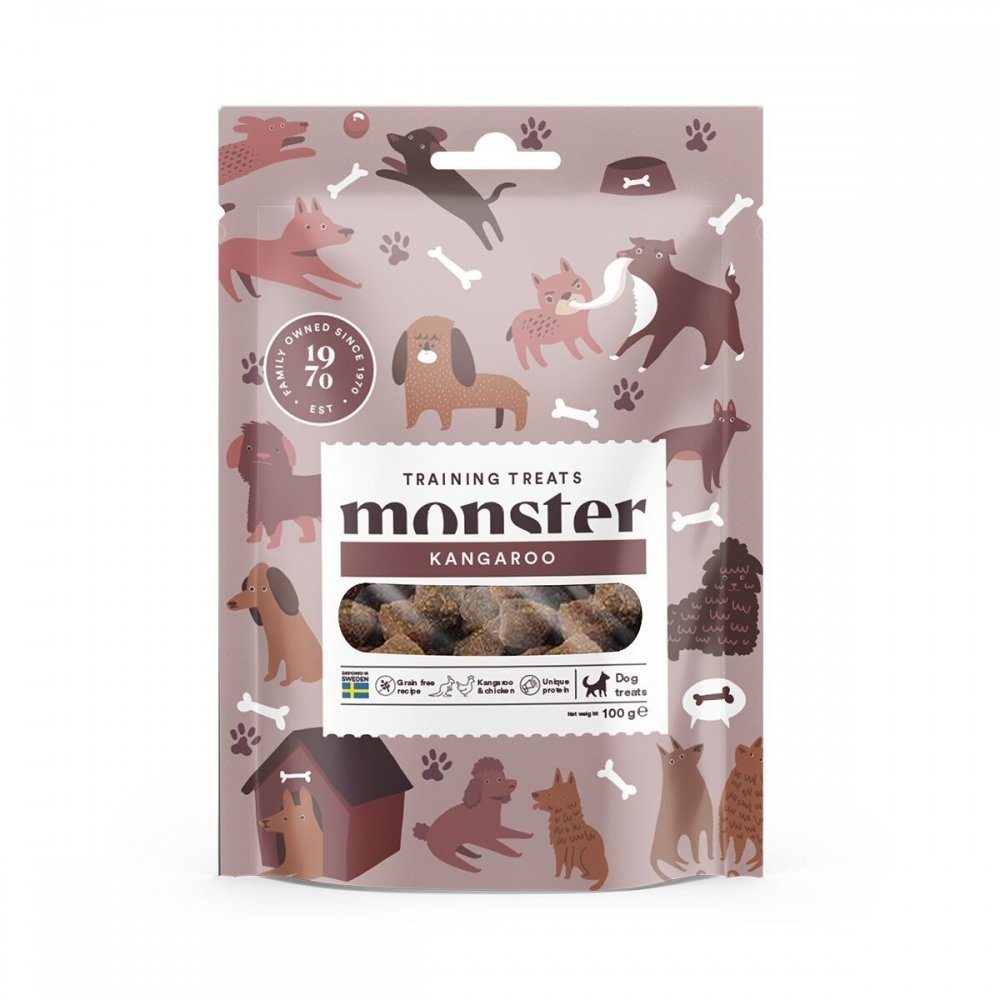 Monster Dog Training Treats kana & kenguru ovat viljattomia koiran makupaloja, jotka sisältävät yhteensä 70 % kanaa ja kengurua. Terveelliset, puolikosteat ja murenemattomat koiran herkut ovat täydellisiä palkitsemiseen niin lenkillä kuin treeneissä. Pakkauskoko 100 g.