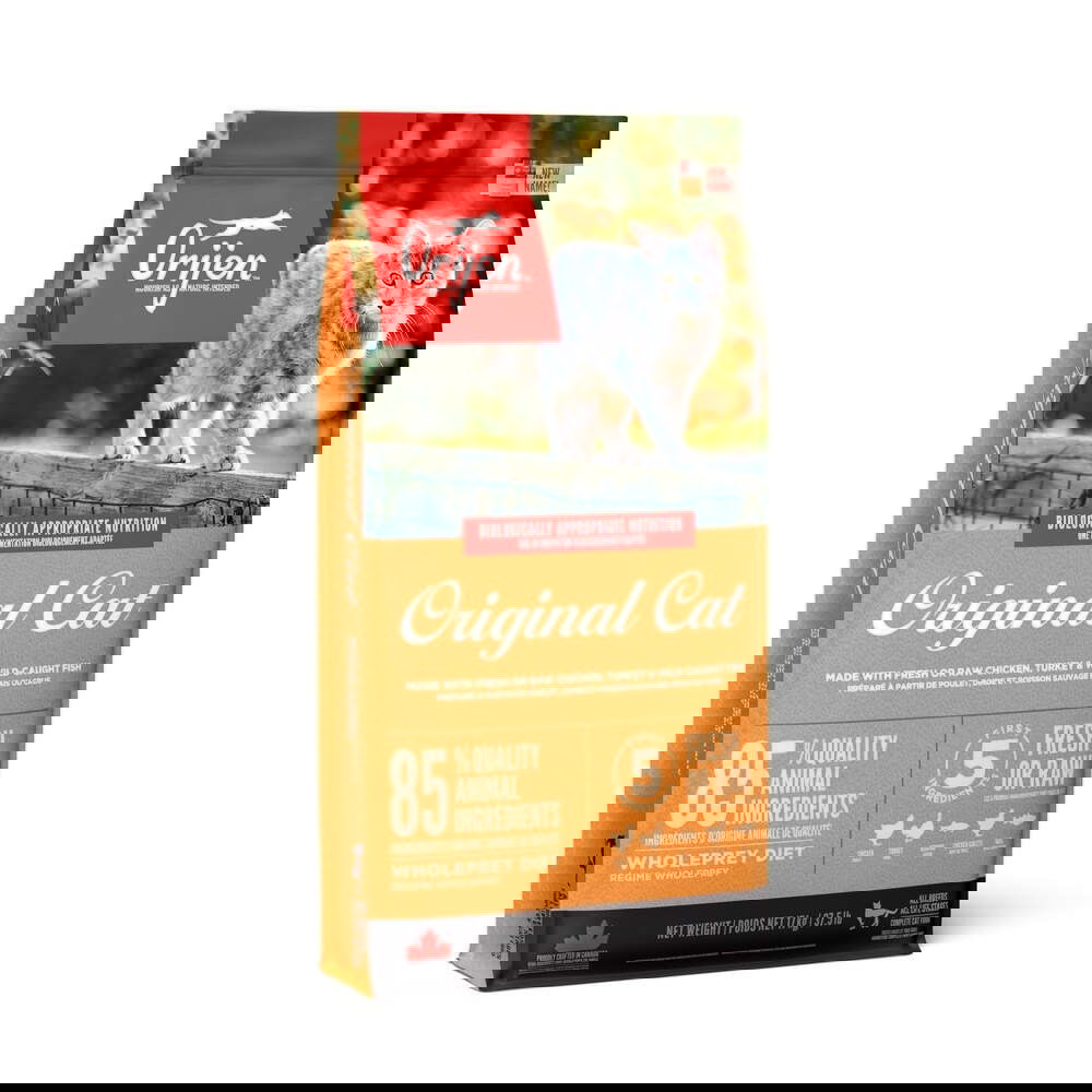 Orijen Cat Original on luontaisesti sopiva täysravinto kaikenikäisille kissoille. Kaikki kissat ovat luonnostaan lihansyöjiä ja ne ovat kehittyneet hyödyntämään kokonaisesta saaliseläimestä kuten linnusta tai kalasta koostuvaa ruokavaliota. Kissojen ruokavalion tulisi sisältää runsaasti ja monipuolisesti lihaa sekä pienempiä määriä hedelmiä, vihanneksia, kasveja ja marjoja. Whole Prey on kokonaisesta saaliseläimestä koostuva ruokavalio. Kokonaisen riistaeläimen, kalan tai linnun ravitsemuksellinen koostumus vastaa täydellisesti kissojen ravintotarpeita. Tästä syystä Orijen sisältää kaikki kolme kokonaisen saaliseläimen osaa tietyssä suhteessa: LIHAA 70–85 % Korkea lihapitoisuus tarjoaa kissoille runsaan ja luonnollisen välttämättömien aminohappojen lähteen. ELIMIÄ 10–15 % Tuore maksa ja mahalaukku ovat erittäin ravitsevia vitamiinien ja kivennäisaineiden lähteitä ja ne sisältävät muun muassa rautaa, sinkkiä sekä A-, D- ja B-vitamiineja. SYÖMÄKELPOISIA LUITA 5–10 % Luut, luuydin ja rustot ovat luontaisia ja täydellisen tasapainoisia kalsiumin, fosforin, glukosamiinin ja kondroitiinin lähteitä. Orijen Cat Original sisältää 85 % paikallista, vapaana kasvatettua kanaa ja kalkkunaa, kokonaisia kananmunia sekä lähialueiden vesistä vapaana pyydettyä kalaa. Raaka-aineet toimitetaan valmistajalle tuoreena, joten niiden ravintoarvo ja maku ovat vertaansa vailla. Runsas, erittäin ravitsevien lihaproteiinien määrä ylläpitää rasvatonta lihasmassaa. Orijen Cat Original on matalahiilihydraattinen ja sisältää vain 15 % hitaasti imeytyviä hiilihydraatteja: vihanneksia, hedelmiä ja yrttejä. Matalaglykeeminen koostumus edesauttaa pitämään verensokeripitoisuuden vakaana. Orijen-ruoat eivät sisällä lainkaan viljaa, perunaa eikä lisäaineita. Kanadan parhaista ja tuoreista raaka-aineista tuotettu Orijen Cat Original pitää parhaan ystäväsi terveenä ja elinvoimaisena. Tuoteselosteen luettuasi uskomme, että olet kanssamme samaa mieltä! ENERGIAJAKAUMA Metabolinen energia on 4160 kcal/kg. Energiajakauma koostuu 39 % proteiineista, 43 % rasvoista ja 18 % hedelmistä ja vihanneksista. ENERGIAMÄÄRÄ ME = 4060 kcal/kg tai 500 kcal/250ml mitta, jossa energiasta muodostuu 40 % valkuaisaineista, 42 % rasvoista ja 18 % hedelmistä ja vihanneksista.