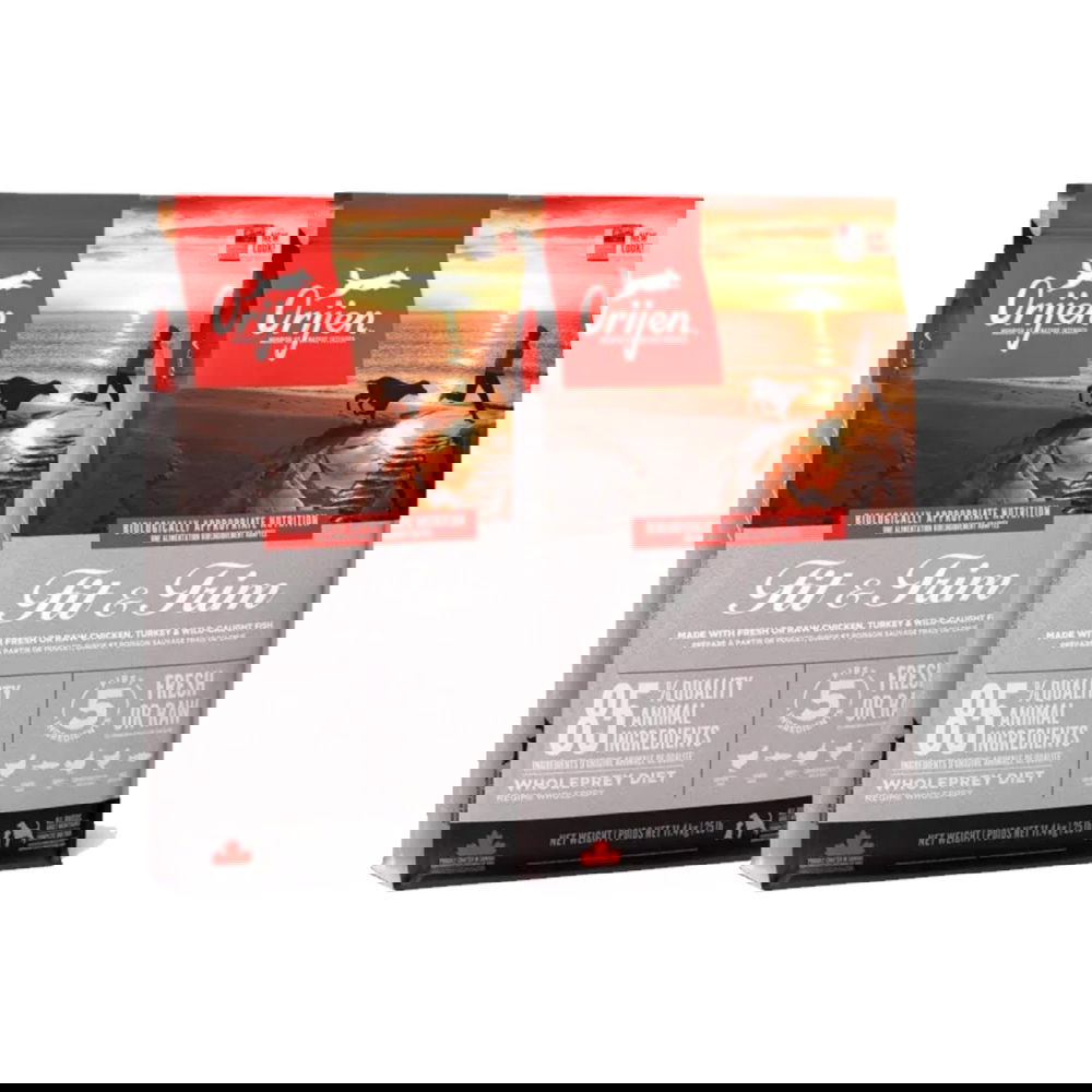 Orijen Fit & Trim 2×11,4 kg -tuplasäkkitarjous! Orijen Fit & Trim -koiranruoka on luonnollinen ja lihaista täysravinto kaikenkokoisille koirille kaikkiin elämänvaiheisiin, se sisältää 40 % proteiinia ja 13 % rasvaa. Vähähiilihydraattinen ja matalaglykeeminen Orijen Fit & Trim tarjoaa koirallesi kaikki tarvittavat ravintoaineet maistuvassa muodossa. Orijen Fit & Trim sisältää ainutlaatuisen yhdistelmän vapaana kasvanutta kanaa ja kalkkunaa, luonnonkalaa ja lattiakanalan munia. Raaka-aineet toimitetaan valmistajalle tuoreena, joten niiden ravintoarvo ja maku ovat vertaansa vailla. Orijenin ruokintafilosofia peilaa koirien esi-isien ruokavaliota ilman viljaa, kasviperäisiä proteiineja tai synteettisiä lisäaineita. Koirat ovat kehittyneet lihansyöjiksi ja niiden ruokavalion tulisi sisältää runsaasti ja monipuolisesti lihaa sekä pieniä määriä hedelmiä, vihanneksia, kasveja ja marjoja. Orijen Fit & Trim on matalahiilihydraattinen ja sisältää vain 15 % hitaasti imeytyviä hiilihydraatteja: vihanneksia, hedelmiä ja yrttejä. Matalaglykeeminen koostumus edesauttaa pitämään verensokeripitoisuuden vakaana. Orijen-koiranruoat eivät sisällä lainkaan viljaa, perunaa eikä lisäaineita. Orijen Fit & Trim on tuotettu parhaista raaka-aineista. Lue tuoteseloste ja vakuutu! 85 % vapaana kasvanutta siipikarjaa ja vapaana pyydettyä luonnonkalaa, 42 % ravitsevaa proteiinia, 13 % rasvaa, 15 % hiilihydraatteja vihanneksista, hedelmistä ja yrteistä. 2/3 lihoista on tuoreista tai pakastetuista raaka-aineista ilman säilöntäaineita. 1/3 lihoista on kuivattu 90 asteessa – korkea proteiininlähde. Lihat, sisäelimet ja kokonaisina kalat ja kananmunat tarjoavat luonnollisen lähteen kaikille koiran tarvitsemille ravintoaineille. Viljaton koiranruoka ilman lisättyjä säilöntäaineita – ei mitään turhaa.