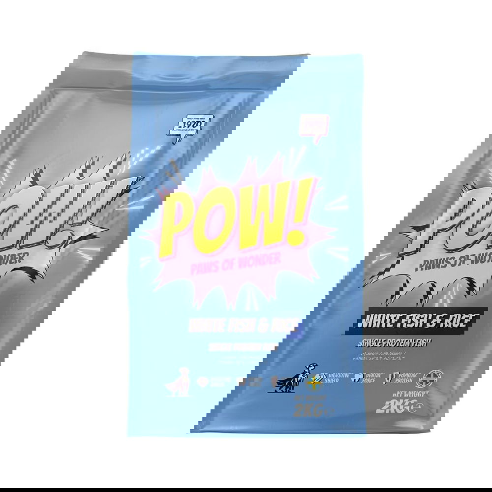 POW! Dog Adult White Fish & Rice – vatsaystävällistä voimaa valkoisesta kalasta POW! White Fish & Rice on herkkävatsaisen koiran ruoka, joka sisältää vain yhtä eläinproteiinia: siikaa. Laadukas ja helposti sulava proteiini yhdistettynä vatsaa helliviin ainesosiin, kuten riisiin, pre- ja probiootteihin sekä mineraalirikkaaseen saveen, tekee tästä kuivaruoasta todellisen arjen sankarin valinnan. Aktiiviset mineraalit auttavat myös torjumaan hammaskiven muodostumista. Single protein -resepti: valkoinen kala (33 % kuivattuna + hydrolysoitu siika) Sopii yli vuoden ikäisille aikuisille koirille kaikista roduista Proteiinia 29 %, rasvaa 15 % – tasapainoinen koostumus Prebiootit, probiootit ja mineraalipitoinen savi – kolmiteho vatsan tueksi Mineraalit ehkäisevät hammaskiven muodostumista Maukas ja luonnollinen – sisältää yrttejä, marjoja ja hedelmiä