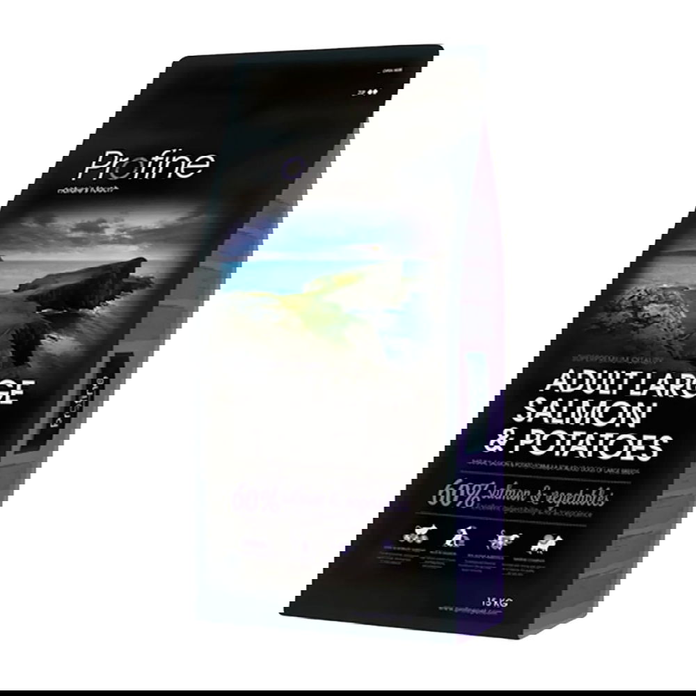Profine Dog Adult Large Salmon -koiran kuivaruoka on erityisesti suunniteltu suurten rotujen aikuisille koirille. Täysravinto edistää koirasi yleistä terveyttä ja hyvinvointia yhdistämällä korkean pitoisuuden lohta ja perunaa sekä lisättyjä ravintoaineita. Profine-koiranruoka on hyvin sulavaa ja maittavaa. Koostumus on rikastettu tärkeillä ravintoaineilla, jotka tukevat ihoa, turkkia, suuren koiran nivelten terveyttä ja immuunijärjestelmää. Sisältää 38 % lohta. Tukee ihoa ja turkkia omega-3- ja omega-6-rasvahapoilla. Edistää nivelten terveyttä luonnollisilla nivelravinteilla. Tukee ruoansulatusta ja suoliston terveyttä prebiooteilla ja merilevällä. Vahvistaa immuunijärjestelmää luonnollisilla ainesosilla ja vitamiineilla.