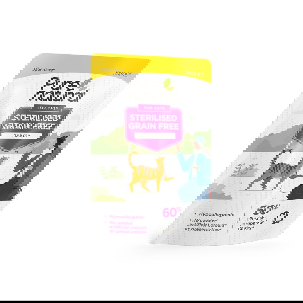 Purenatural Cat Grain Free Sterilised Kalkkuna on viljaton ja sokeriton kissan märkäruoka kalkkunasta 1-7-vuotiaille kissoille. Luonnollinen ja lihapitoinen koostumus sisältää kaikki kissan tarvitsemat ravintoaineet. Kalkkuna on hyvin sulava proteiininlähde ja ravintoaineet ovat helposti kissan hyödynnettävissä. Tuoreet ja lihaisat raaka-aineet antavat märkäruoalle herkullisen maun ja kalkkuna ainoana eläinproteiininlähteenä voi sopia monille herkkävatsaisille tai allergisille kissoille. Luonnollista, terveellistä ja maistuvaa! Pakkauskoko 100 g.