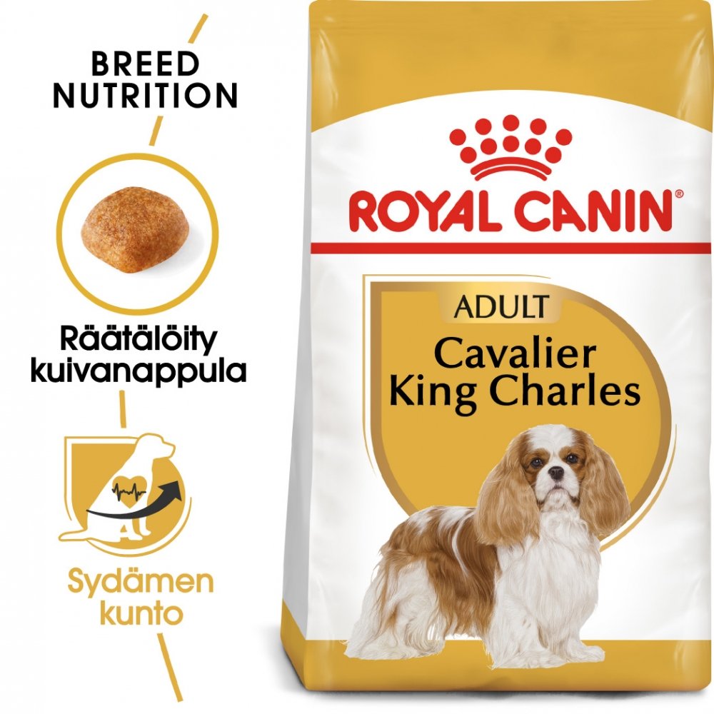 Royal Canin Cavalier King Charles Adult on täysravinto aikuisille, yli 10 kk ikäisille, cavalier kingscharlesinspanieleille. Sisältää sydämen hyvinvoinnin tukemiseen välttämättömiä ravintoaineita: mukautetun elektrolyyttipitoisuuden, EPA & DHA -rasvahappoja, tauriinia, L-karnitiinia sekä antioksidantteja. Nappulan muoto on suunniteltu helpottamaan cavalier kingcharlesinspanielia nappulan suuhun poimimisessa ja pureksimisessa.