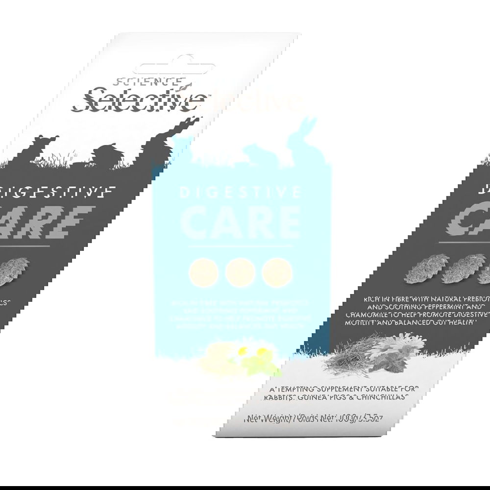 Science Selective Digestive Care 100 g – täsmätuki pienlemmikin vatsalle ScienceS Digestive Care on erikoisvalmiste, joka tukee kanien, marsujen ja chinchillojen ruoansulatuksen terveyttä. Tuote on osa Supreme Petfoods -sarjan ravintolisävalikoimaa, joka on kehitetty täyttämään pienlemmikkien erityiset ravitsemukselliset tarpeet. Korkealaatuisista ainesosista valmistettu Digestive Care tukee suoliston tasapainoa ja auttaa varmistamaan sujuvan ruoansulatuksen. Suunniteltu varta vasten vatsan hyvinvointiin – helposti annosteltava ja herkullinen lisä päivittäiseen ruokavalioon. Tuotteen tärkeimmät ominaisuudet: Sopii kaneille, marsuille ja chinchilloille – täsmätuki monen lajin tarpeisiin Tukee ruoansulatuskanavan tasapainoa – hyvinvointia sisältäpäin Korkealaatuiset raaka-aineet – turvallinen ja tehokas valinta Kehitetty eläinten erityistarpeisiin – asiantuntijoiden suunnittelema koostumus Helppo annostella – lisätään muun ruoan joukkoon Sopii erityisesti kaneille, marsuille ja chinchilloille, joille on taipumusta maha-suolikanavan pysähtymiseen likaiseen turkki peräpäässä kaasuuun ja turvotukseen karvapallojen muodostumiseen
