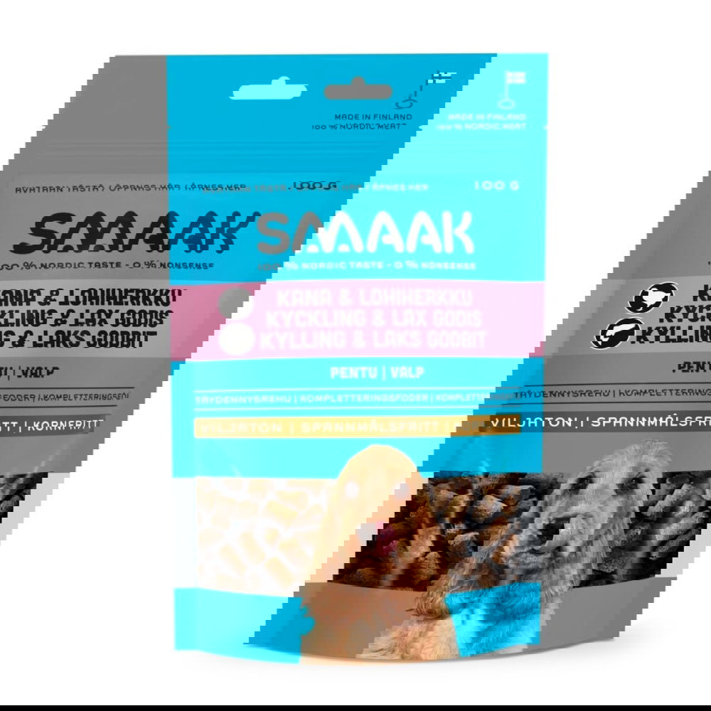 SMAAK Pentu kana & lohiherkku 100 g – Maistuvat kotimaiset koulutusnamit pennun oppimisen tueksi SMAAK Pentu kana & lohiherkku on juuri pennun suuhun sopiva, pehmeän sitkeä koulutusnamipala, joka motivoi oppimaan iloisesti. Kotimainen koostumus, korkea lihapitoisuus ja luonnollinen maku tekevät näistä herkuista varman suosikin treeneihin, lenkeille tai ihan vain palkitsemiseen arjen keskellä. Tärkeimmät hyödyt ja ominaisuudet Korkea lihapitoisuus – 40 % tuoretta ja 40 % kuivattua kanaa + 10 % tuoretta lohta Kotimainen valmistus – kehitetty ja tehty Liedossa Viljaton koiran herkku – herkkävatsaisellekin pennulle sopiva Ei tahmaa – taskuystävällinen koostumus treeneihin Maistuva ja motivoiva – täydellinen koulutusnamipala Ekologinen: lyhyet kuljetusmatkat – kana tulee lähitiloilta. Miksi SMAAK on vastuullinen valinta? SMAAK valmistaa herkut Liedon uudessa ympäristöystävällisessä tuotantolaitoksessa. Tuotannossa hyödynnetään aurinkoenergiaa, tuuli- ja vesivoimaa sekä lämmön talteenottoa. Kaikki energia käytetään uudelleen, eikä valmistuksesta synny kierrätyskelvotonta jätettä. Se on paitsi herkkua pennulle, myös hyvä valinta planeetalle. UKK – Usein kysytyt kysymykset 1. Sopivatko nämä herkut herkälle pennulle? Kyllä, resepti on viljaton ja pääosin kanaa ja lohta, joten se sopii useimmille pennuille. 2. Voiko näitä käyttää koulutusnameina? Ehdottomasti! Namit ovat pieniä, helposti katkaistavia ja eivät tahmaa käsissä tai taskussa. 3. Kuinka paljon herkkuja pentu saa syödä päivässä? Herkkujen osuus tulisi olla enintään noin 10 % päivän kokonaisruoasta.