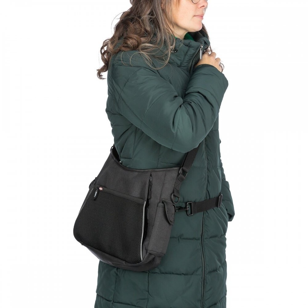 Treenilaukku Trixie useilla taskuilla ja lokeroilla sisä- ja ulkopuolella pitää tarvikkeet järjestyksessä. Toisessa päätytaskussa on aukko kakkapusseille, josta pussit on helppo ottaa yksitellen. Treenilaukussa on vetoketjut päällä sivuissa, sivujen vetoketjut ovat vedenpitävät. Sisävuoraus on vettähylkivää, mikä helpottaa treenikassin puhtaanapitoa. Treenilaukussa on koko matkaltaan säädettävä ja irrotettava vyötärölle kiinnitettävä vyö, joka pitää treenilaukun paikoillaan kävellessä. Olkahihna on topattu ja mukava. Treenilaukussa on useita D-renkaita esim. klikkerin tai koirapillin kiinnittämiseen. Heijastavat yksityiskohdat lisäävät näkyvyyttä hämärällä. Materiaali polyesteri. Mitat 34 x 29 x 9 cm.